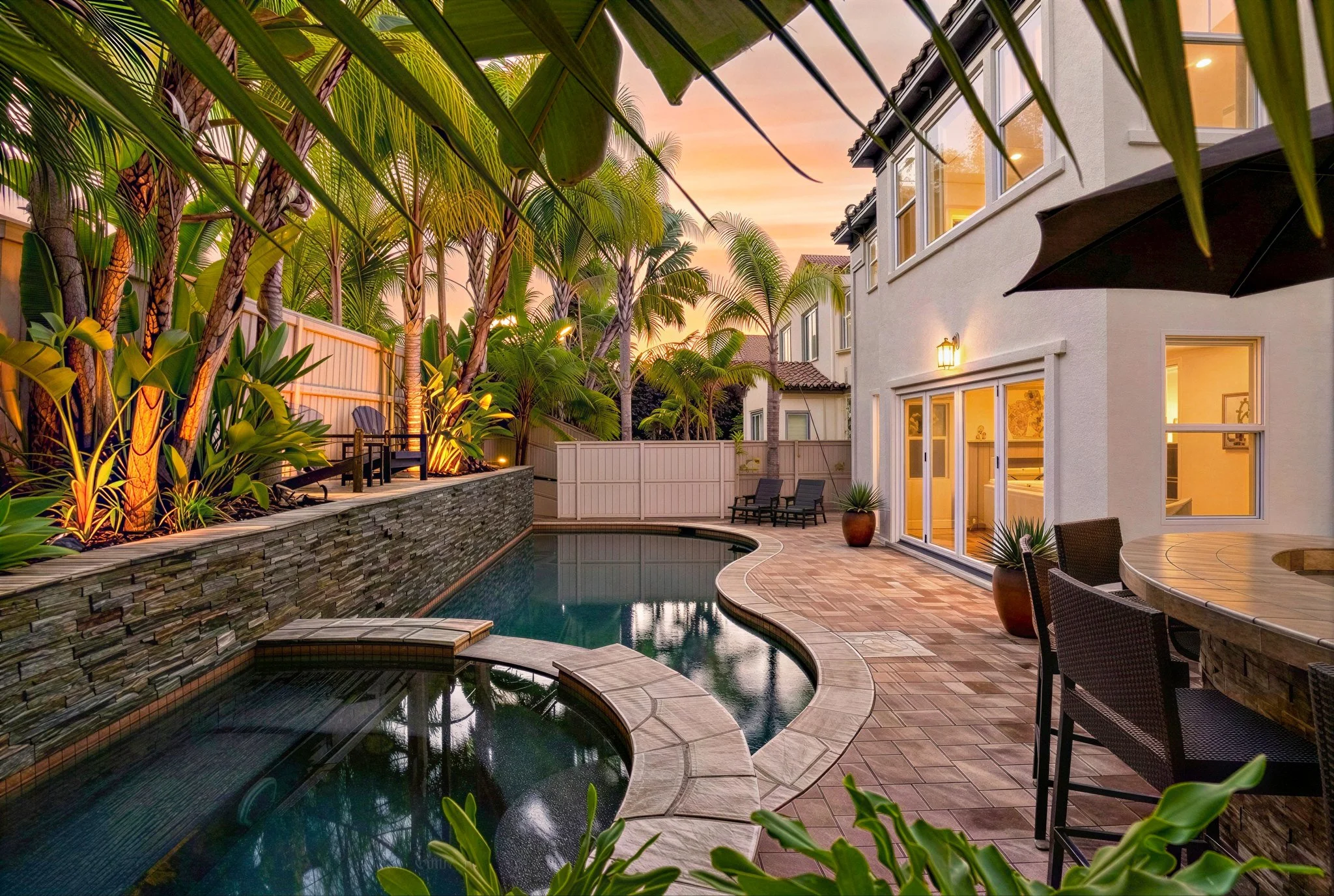 La Cantina doors open to a private backyard oasis with a beautiful pool featuring a Baja shelf, spa with waterfall feature, and built-in BBQ with outdoor fridge. With 3,437 sq ft, this home offers 5 bedrooms, 4 bathrooms, PLUS an office and loft. The chef’s kitchen boasts white shaker cabinetry, soft-close drawers, a large Quartz double waterfall island, custom pendant lighting, herringbone tile backsplash, and newer stainless steel appliances including a Dacor built-in fridge, range/oven with custom hood, double ovens, Bosch dishwasher, wine fridge, and appliance garage. In addition to the walk-in pantry, there's a spacious butler’s pantry with a second wine fridge and abundant storage. The home is distinct and welcoming with a Canary Date palm, mature tropical landscaping, a stamped concrete driveway, and a Dutch door for ocean breezes. Main level includes a full bed and bath, large living/dining room combo, and an office with custom built-ins. Upstairs features 4 additional bedrooms, 3 bathrooms, a loft, and a generous primary suite with dual closets, jetted tub, and large shower. Also includes OWNED solar for house and pool, A/C, tankless water heater, laundry room, and a 2-car garage with storage.